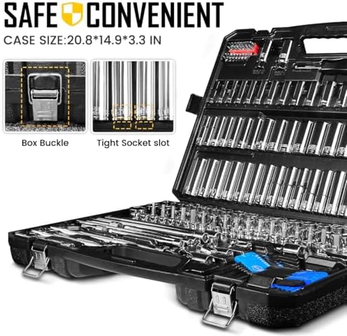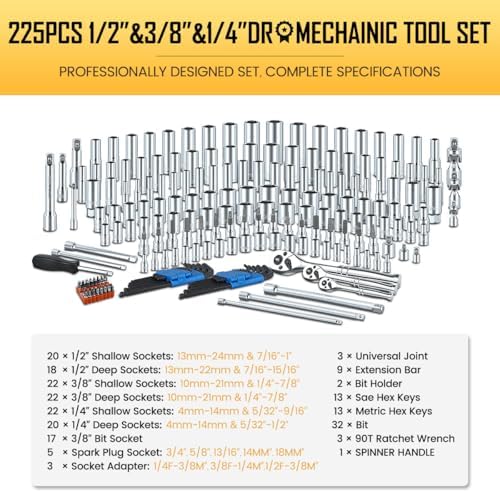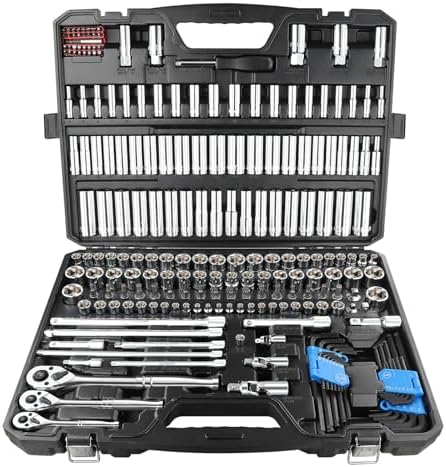 Este conjunto de 225 herramientas incluye dados y llaves de carraca en medidas métricas y estándar. Su diseño robusto con carraca de 90 dientes asegura precisión en cada reparación. Viene con un estuche resistente para un almacenamiento organizado. Ideal para reparaciones de bicicletas y automóviles. Una opción versátil para mecánicos profesionales y aficionados.